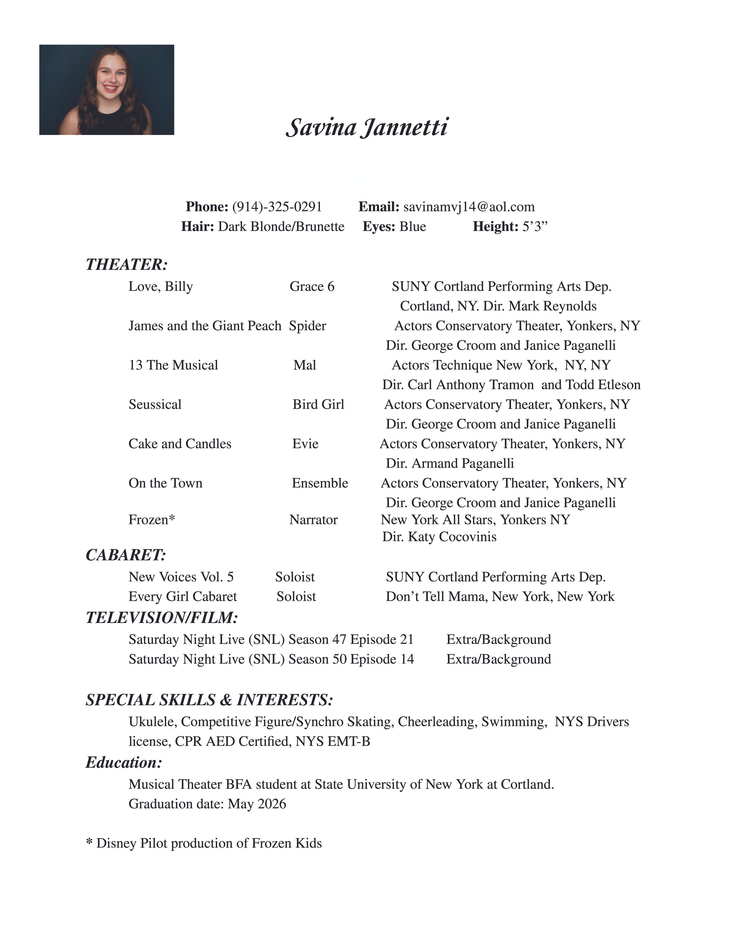 Savina Jannetti is a Musical Theater actress from The Bronx NY. She attends SUNY Cortland and is earning her BFA in Musical Theater with a graduation date of May 2026! Savina is also a New York State Certified EMT.